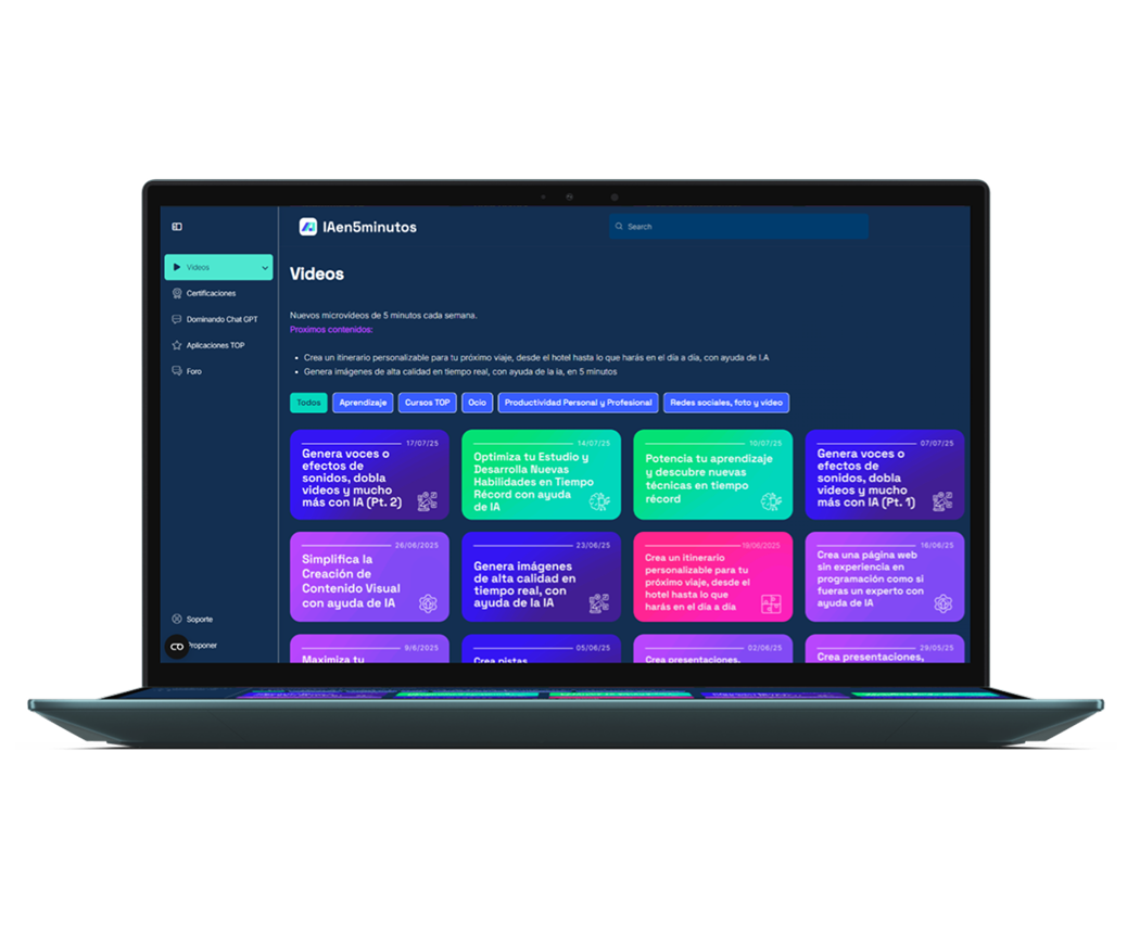 In IA en 5 minutos, a AI educational membership, users struggled to complete certifications due to low awareness, unclear benefits, and difficulty choosing among 12 options. I designed a personalized onboarding and visual tutorial that recommended the right certification, highlighted its value, and simplified access to the exam, reducing friction and boosting motivation.